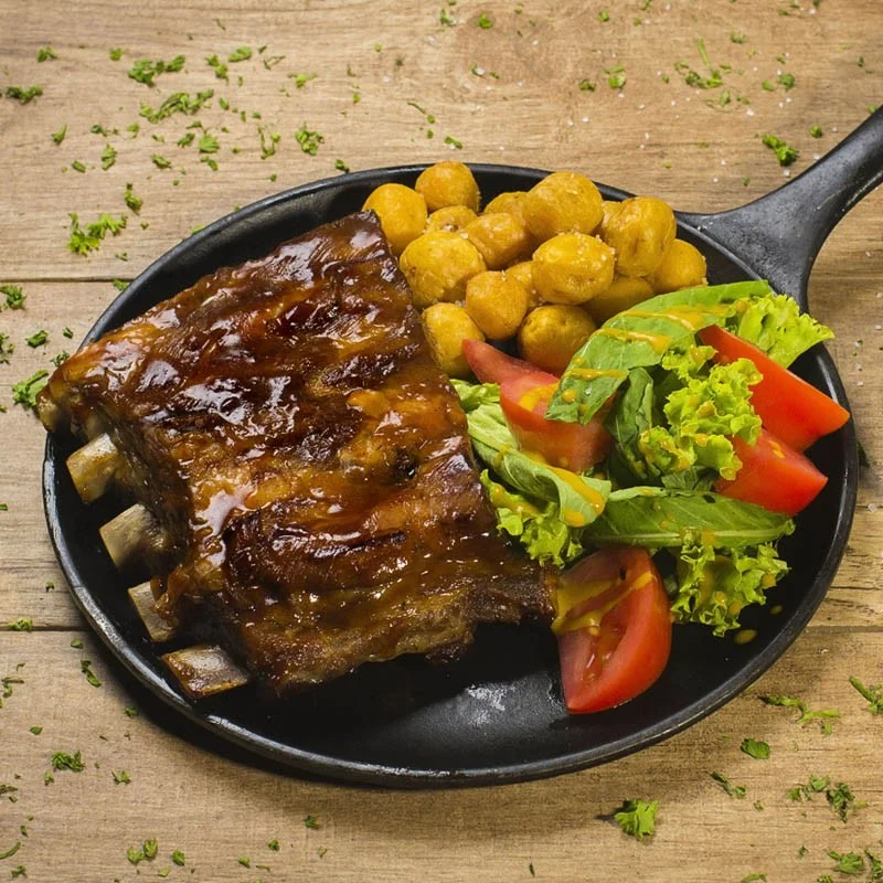 Costilla baby back al cilindro, salsa BBQ, lechuga, rúgula, tomate y papa criolla. (Cocción lenta)