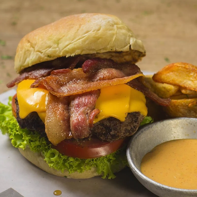 Carne 100% ANGUS, tocineta, pan rústico, doble queso americano, tomate, lechuga, salsa municipal y papa en cascos