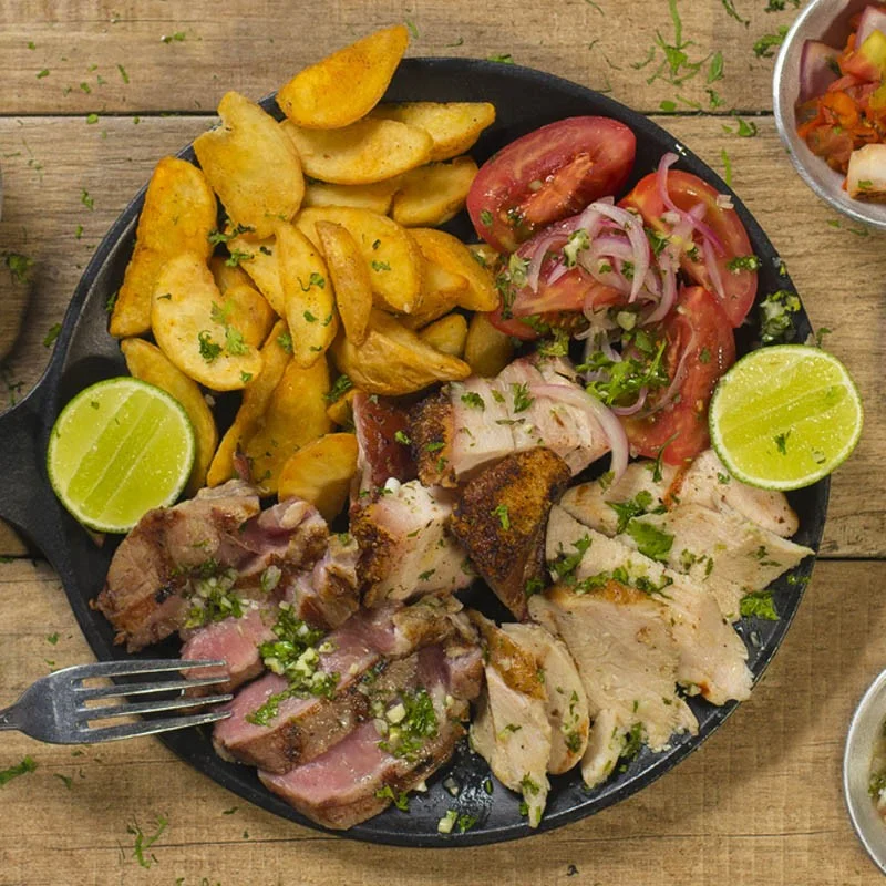 Panceta al cilindro, pavo a la leña, bondiola al cilindro, verduras rústicas, papa criolla, guacamole, chimichurri municipal y salsa BBQ. Acompañada de cebolla peruana con aceite de oliva y panka. (Sugerido para 2 personas)