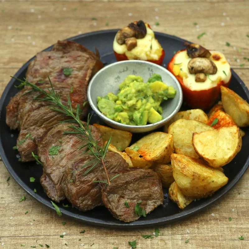 Lomo 100% ANGUS CERTIFIED a la parilla y papas en cascos. Acompañado de pimentón rústico municipal (Pimentón relleno con puré de papa, tocineta y queso gratinado) y champiñón portobello